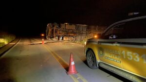 Na madrugada de terça-feira (17), um caminhão tombou na ERS-324, no trecho entre Passo Fundo e Pontão. O veículo, com placas da