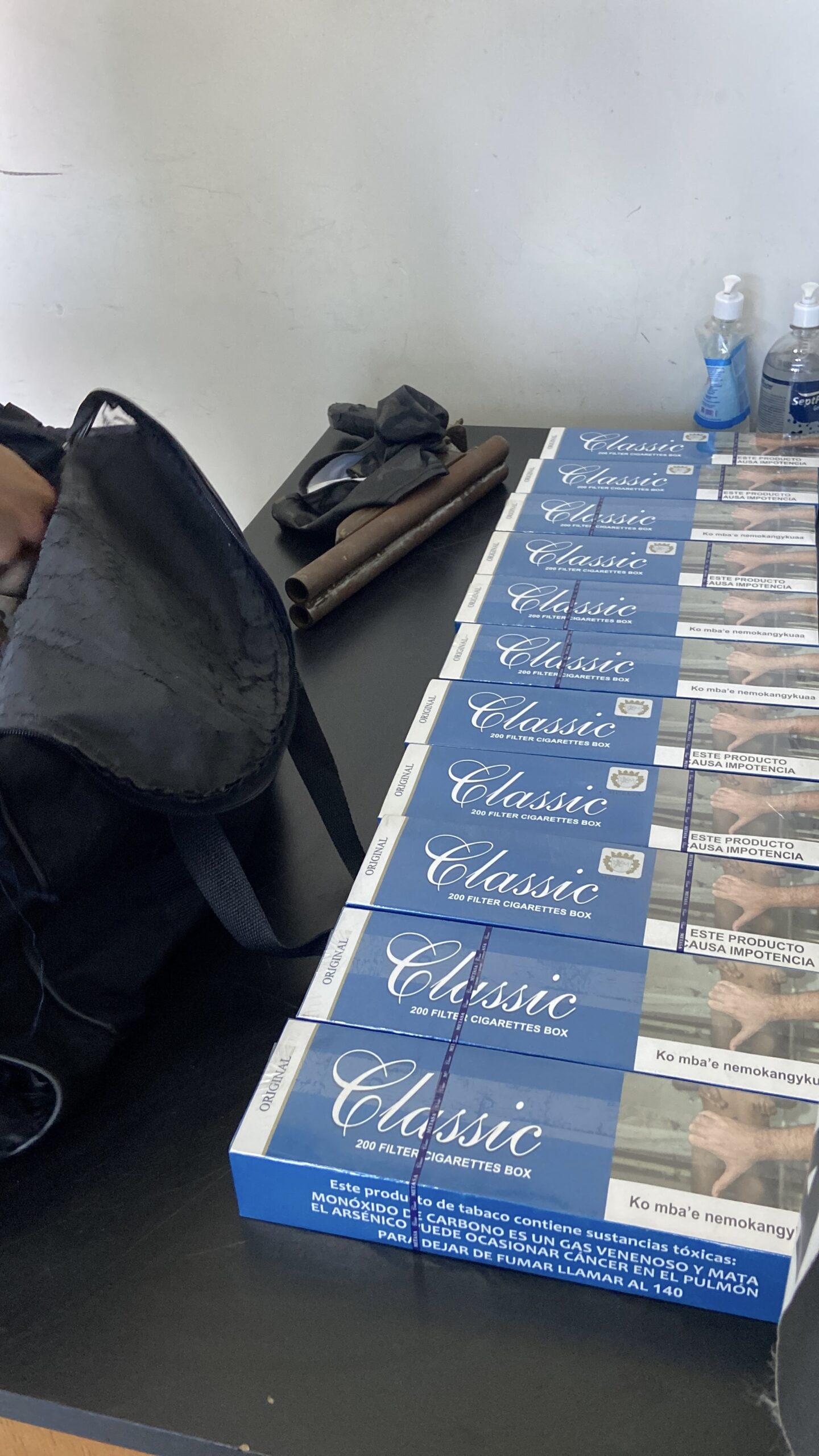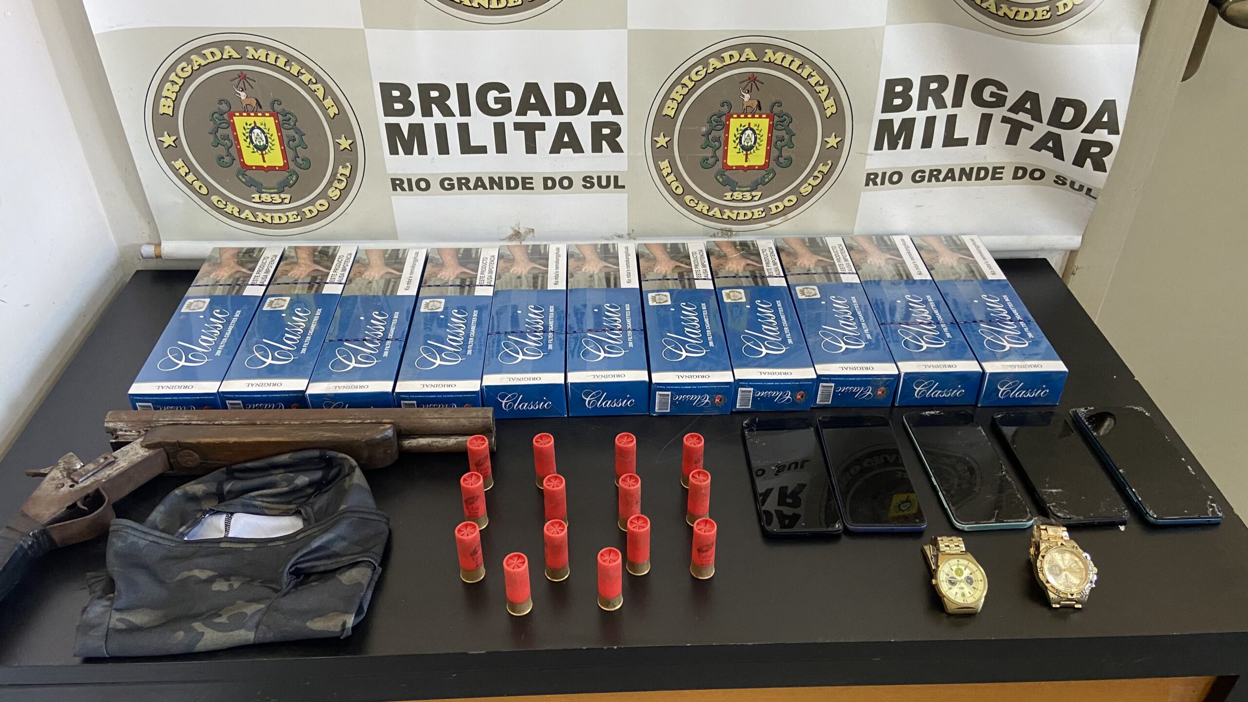 Os policiais ingressaram no imóvel e localizaram diversas caixas de cigarros, uma espingarda calibre 12 e várias munições.
