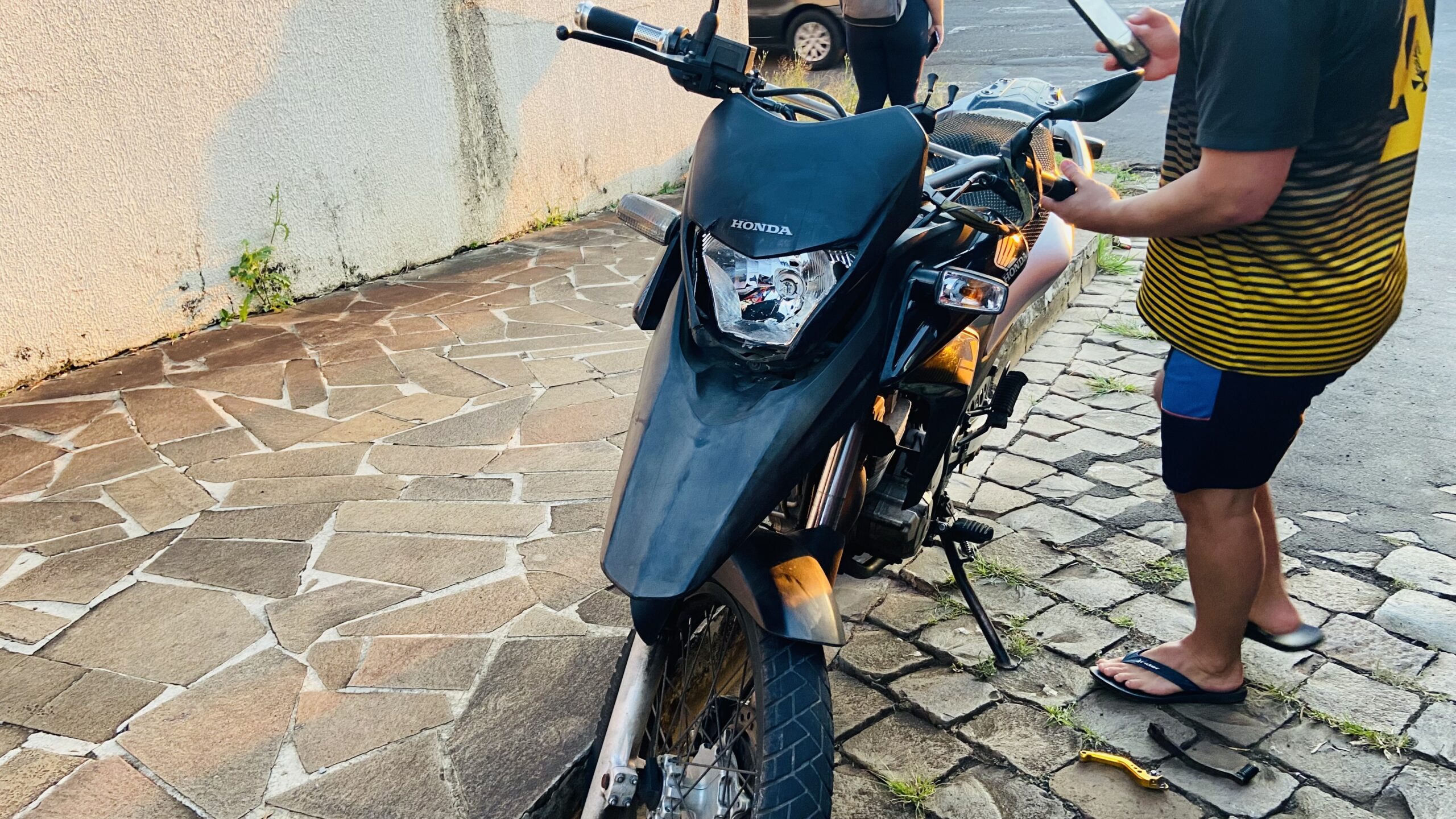 A colisão envolveu um Toyota Corolla e uma Honda XRE 300, na rua Princesa Isabel, no cruzamento com a rua Morom, em Passo Fundo.