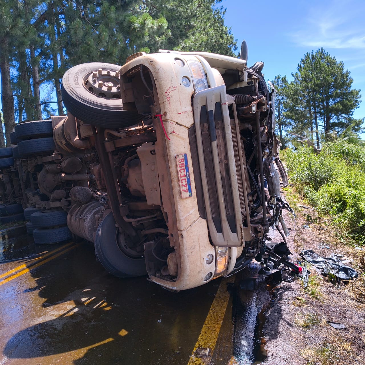 O caminhão também tombou e parou em um barranco à margem da rodovia.