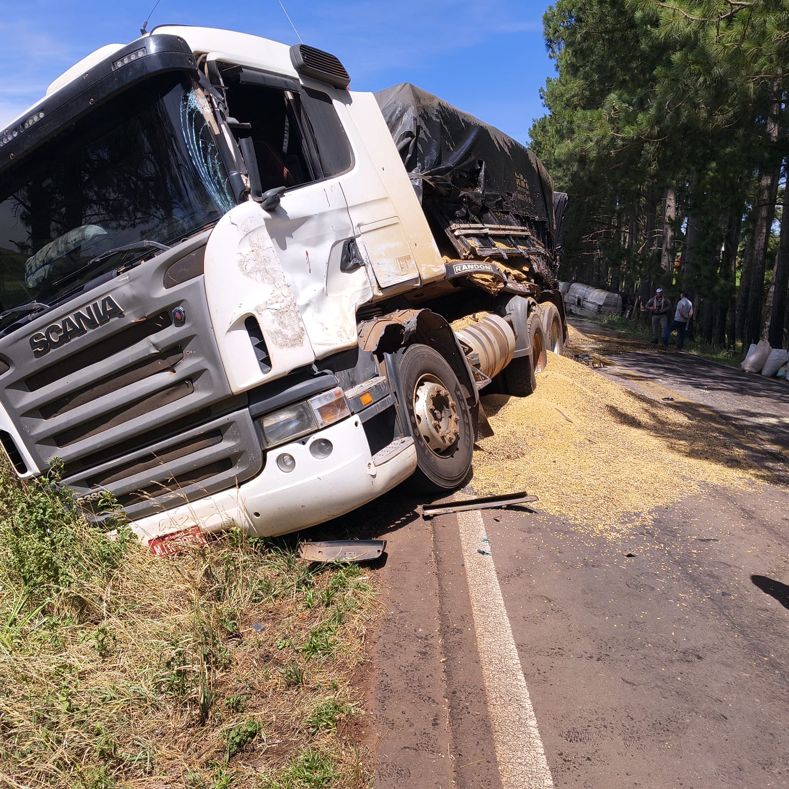 O veículo colidiu com outro bitrem, que transportava grãos de soja, e com um caminhão carregado com sacos de farinha, que seguiam no sentido oposto.