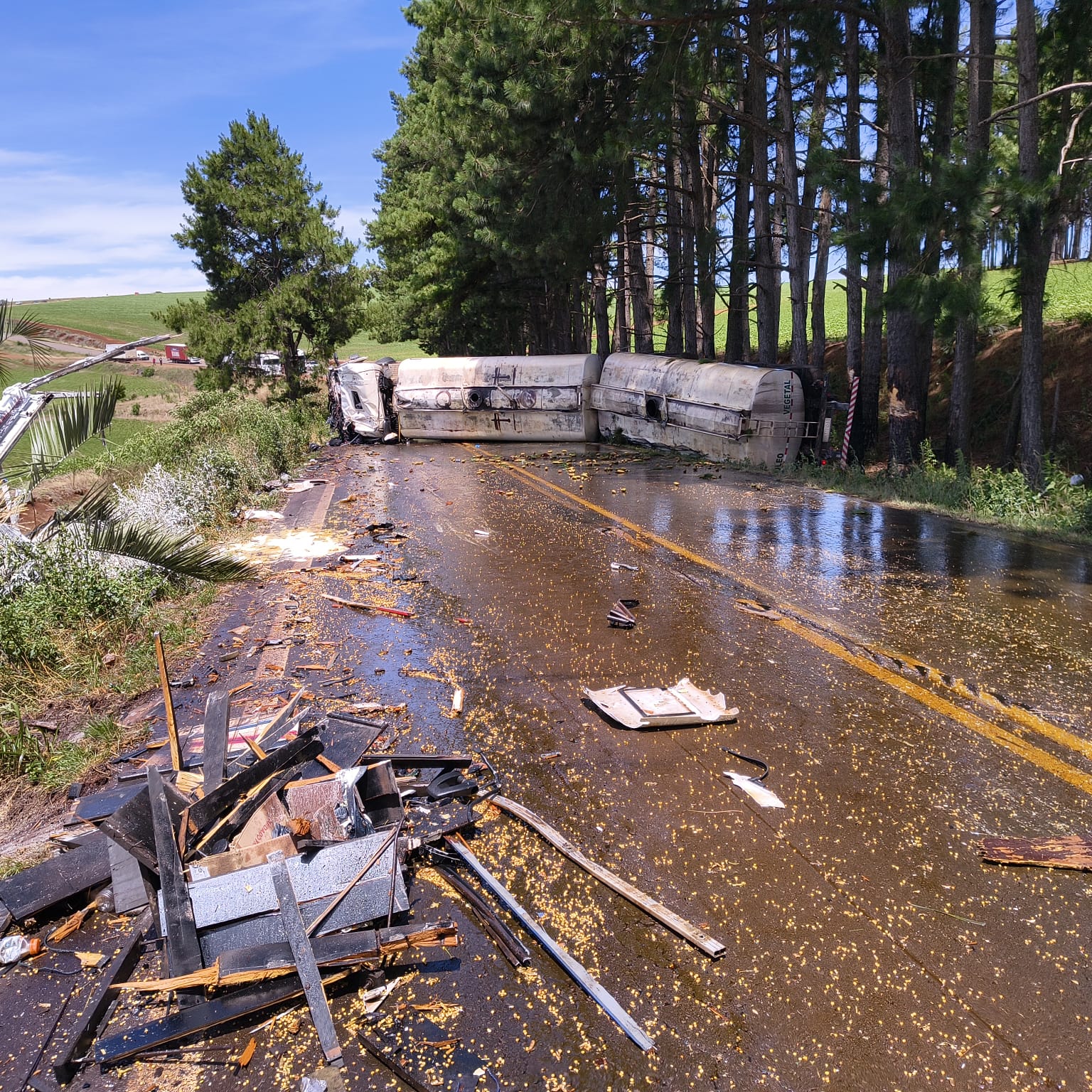 O acidente causou o derramamento de cerca de 45 mil litros de óleo vegetal sobre a pista.