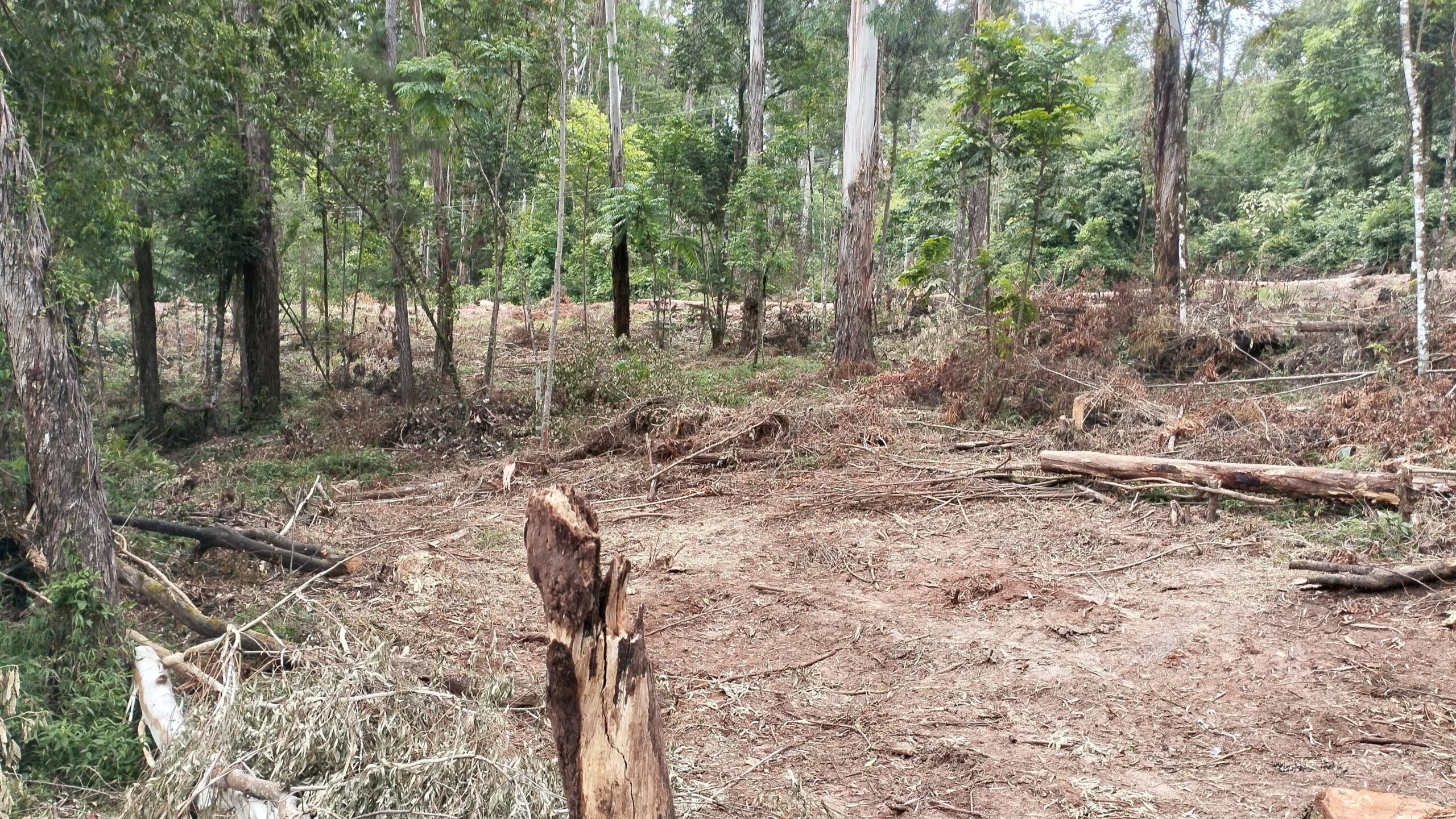 Focos de queima de resíduos vegetais foram encontrados próximos a árvores nativas em regeneração, causando danos, inclusive atingindo uma araucária, espécie ameaçada de extinção.