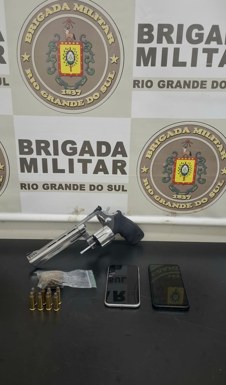 Durante a revista no interior do veículo, os policiais encontraram um revólver calibre 357, de uso restrito, com a numeração suprimida.