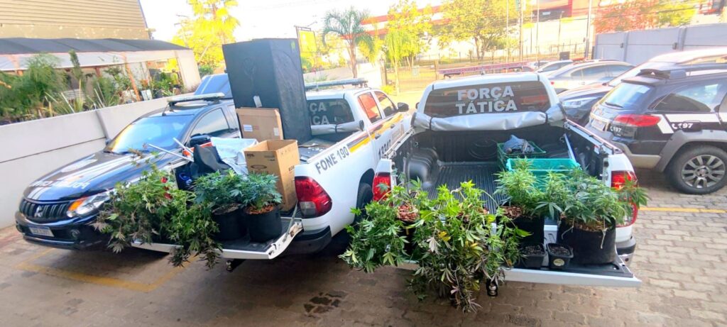 Foram apreendidos oito vasos com plantas, 20 mudas e uma caixa contendo plantas secas, além de duas estufas.