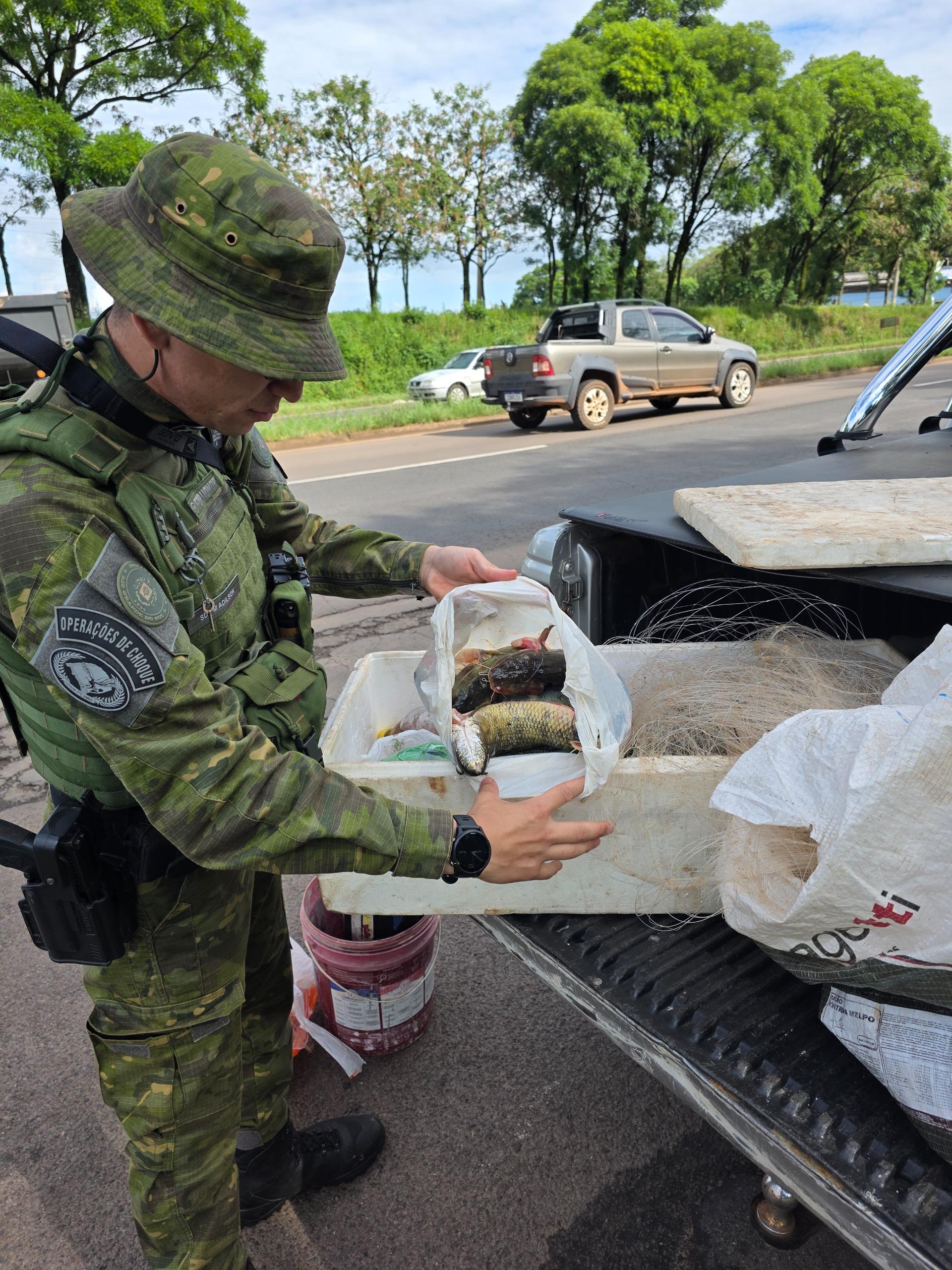 No interior dos veículos, os policiais localizaram cerca de 25 quilos de peixes já mortos, das espécies jundiá e traíra.