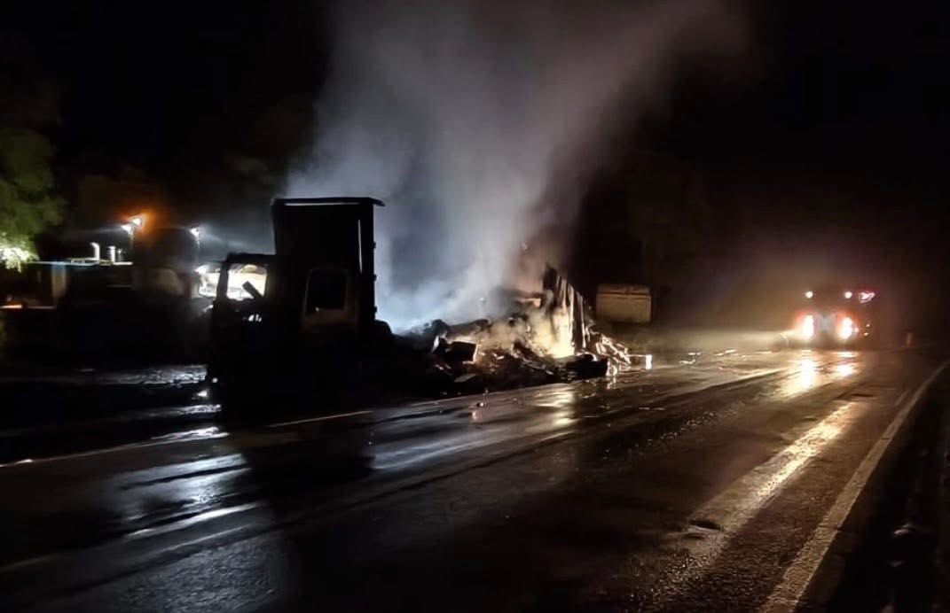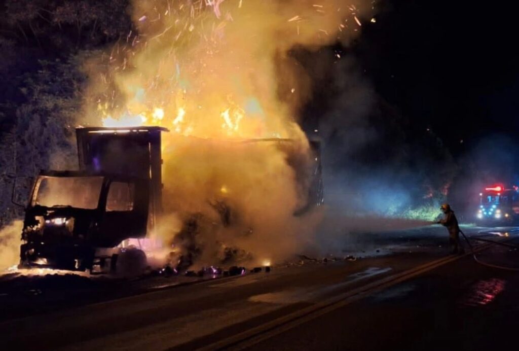 Na madrugada deste sábado (18), um caminhão foi completamente destruído por um incêndio na ERS-135, nas proximidades do Posto Asa Branca, em Sertão.