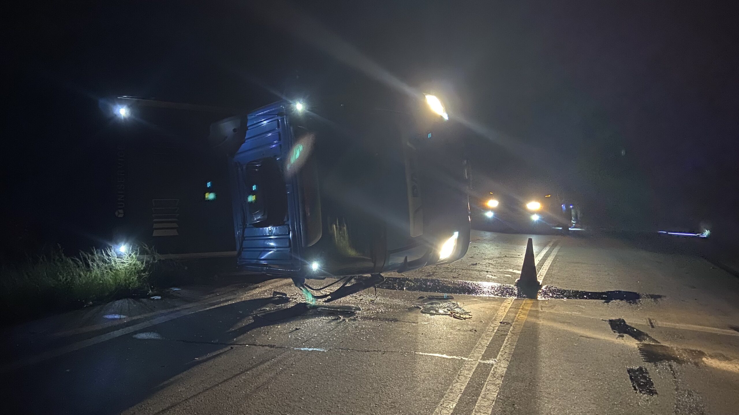 O veículo, com placas da cidade de Medianeira, seguia no sentido Pontão a Passo Fundo quando o condutor perdeu o controle, saiu da pista, caiu em uma valeta e acabou tombando às margens da rodovia.
