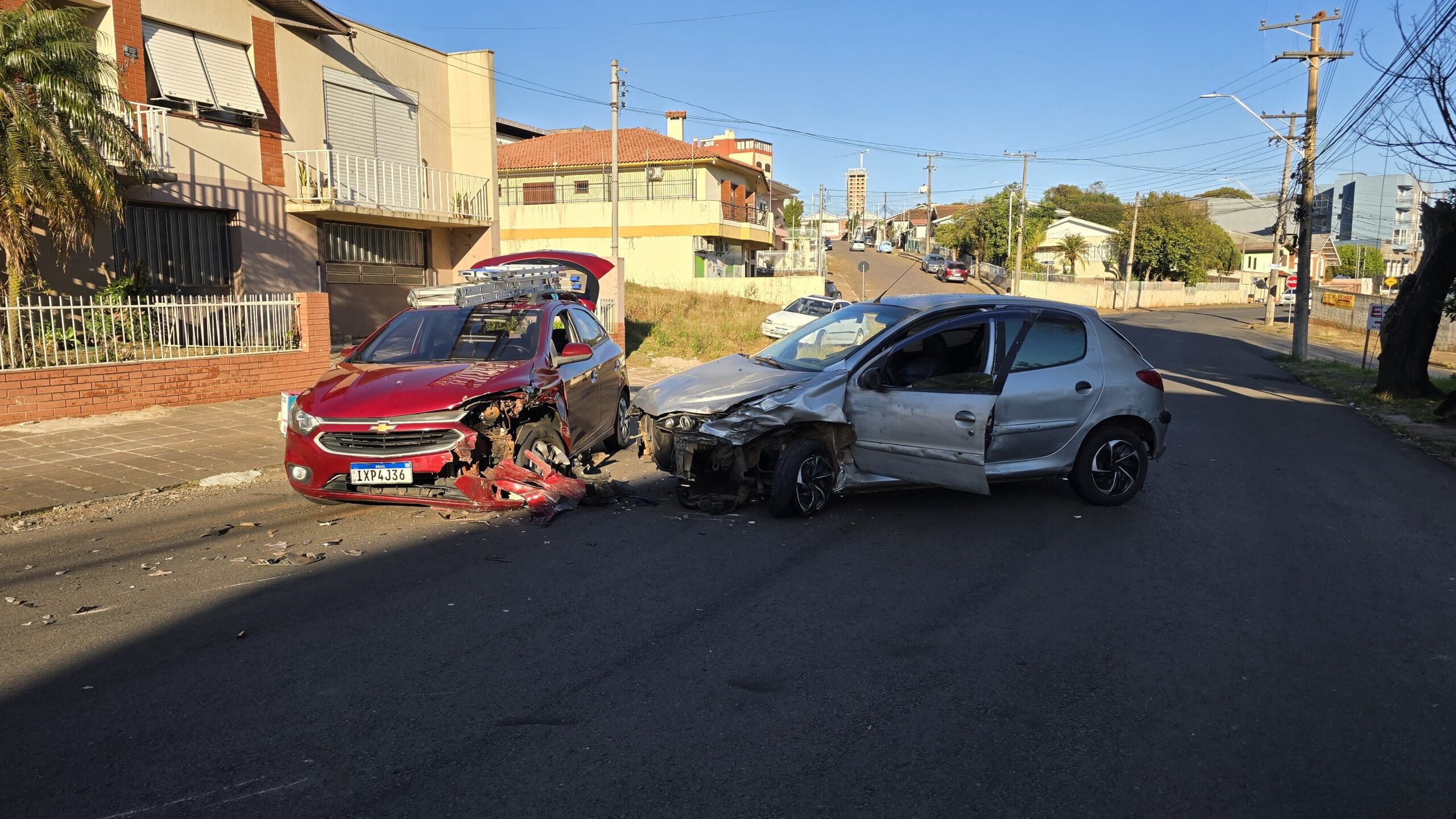 A colisão frontal envolveu dois automóveis: um Peugeot prata, com placas de Canoas, e um Chevrolet Onix de uma empresa, ambos com placas padrão Mercosul.