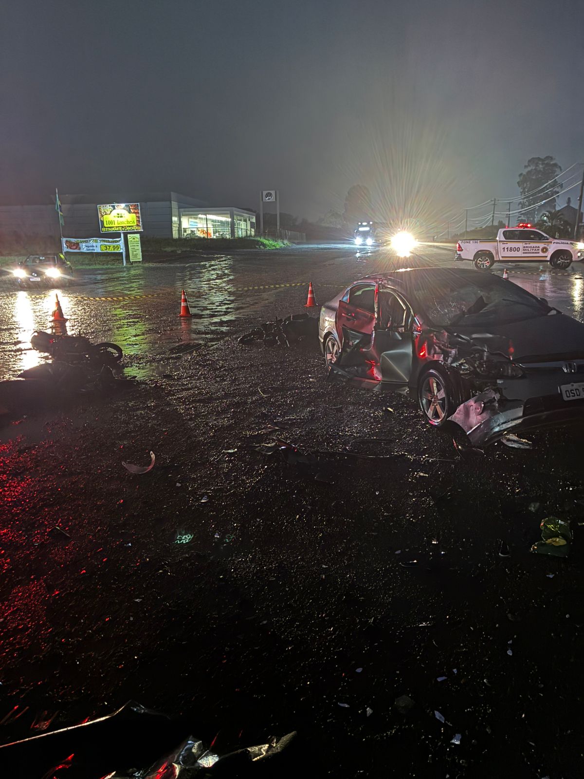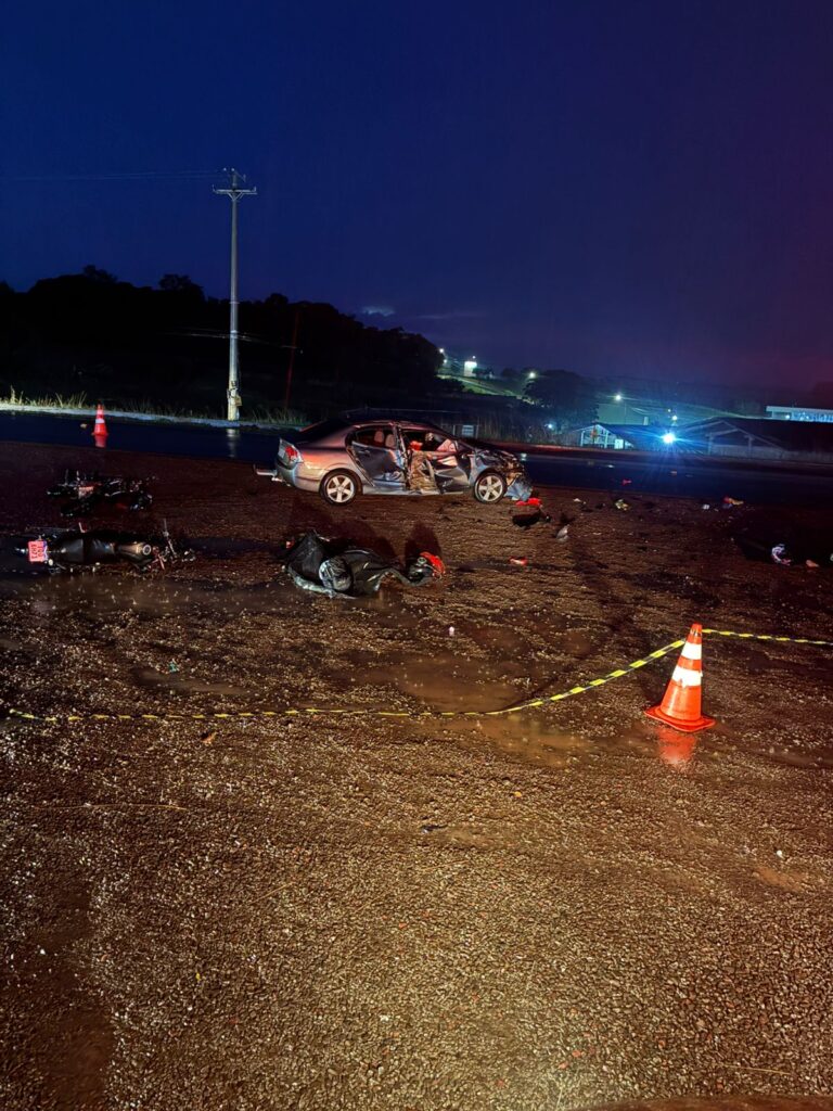 A colisão envolveu um automóvel Honda Civic, com placas de Marau, e duas motocicletas, uma Yamaha Fazer e uma Honda CG, ambas de Passo Fundo.