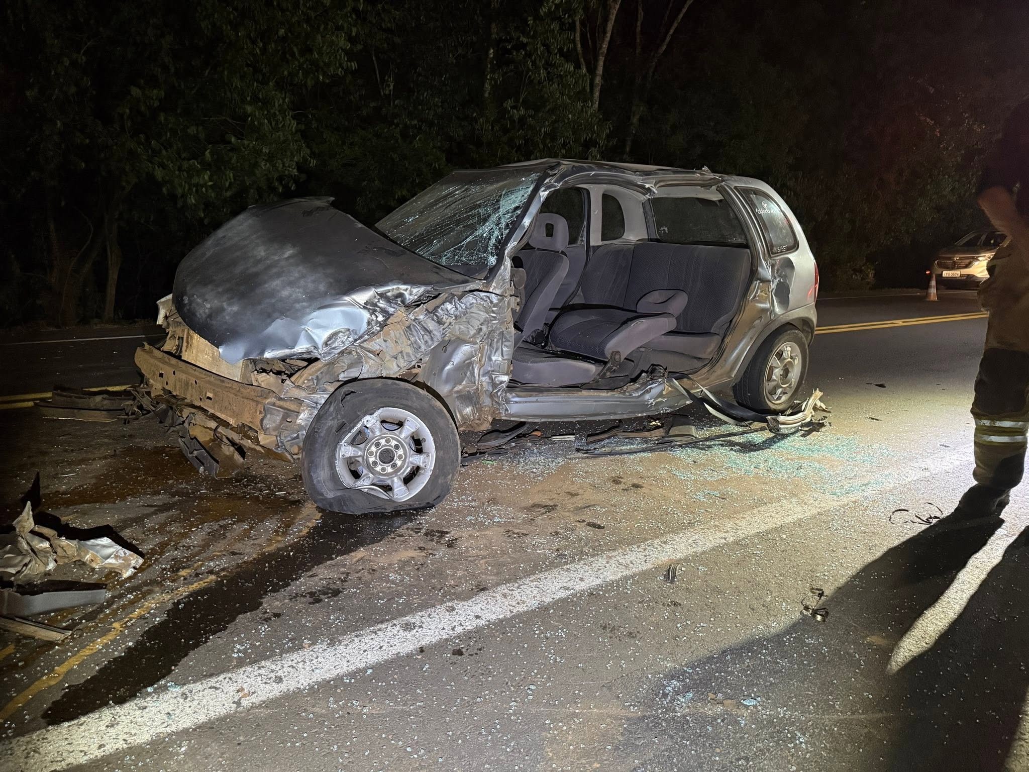 O motorista do Corsa, que estava sozinho no veículo, ficou preso às ferragens.