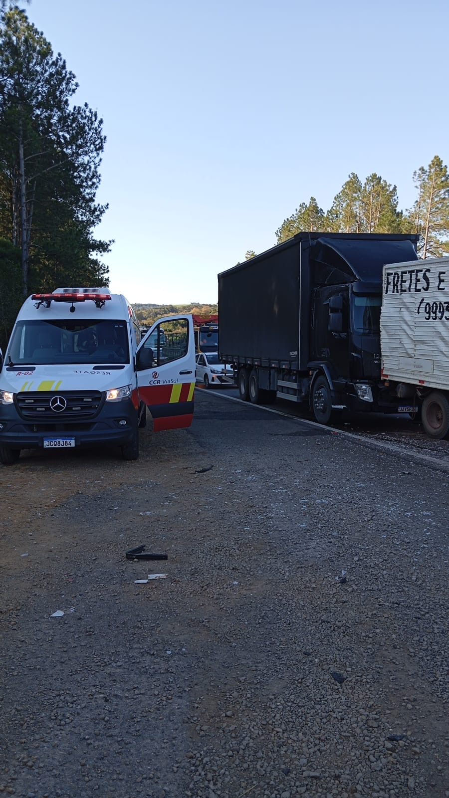 A colisão envolveu três caminhões, incluindo uma carreta, e um carro de passeio.
