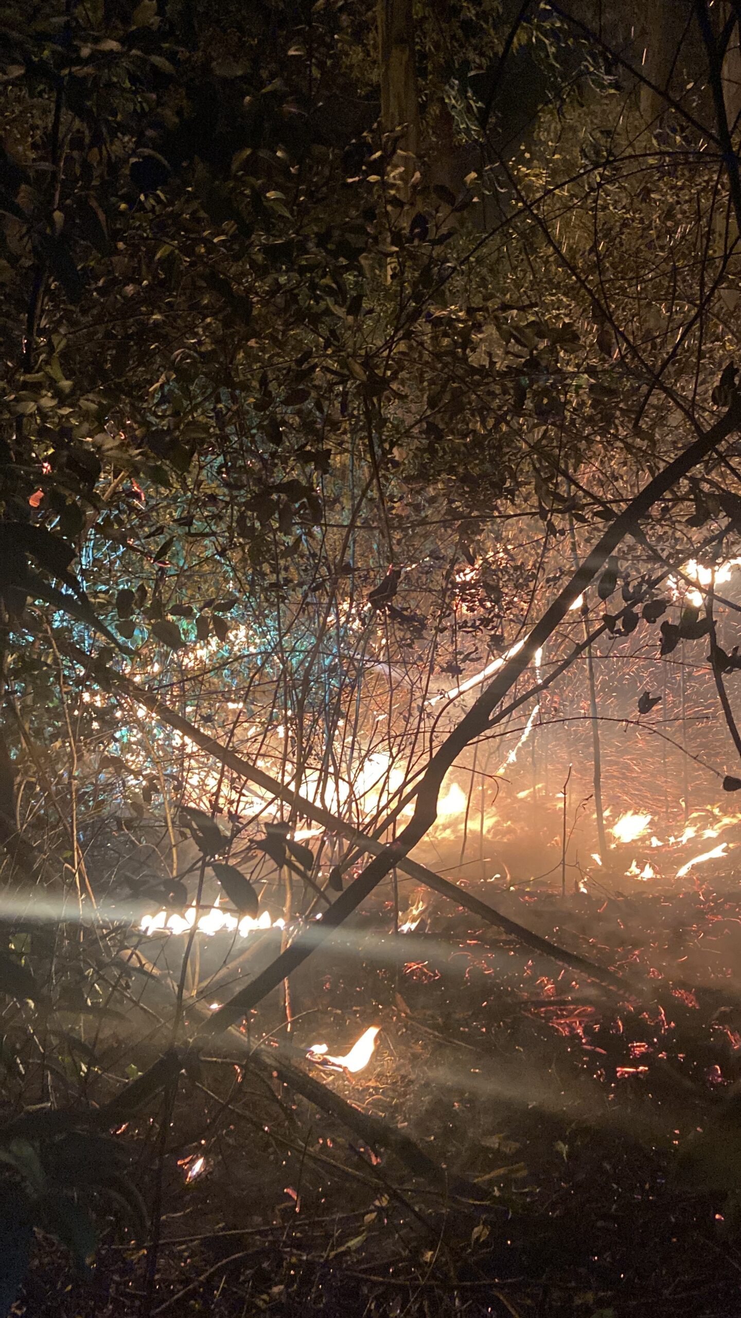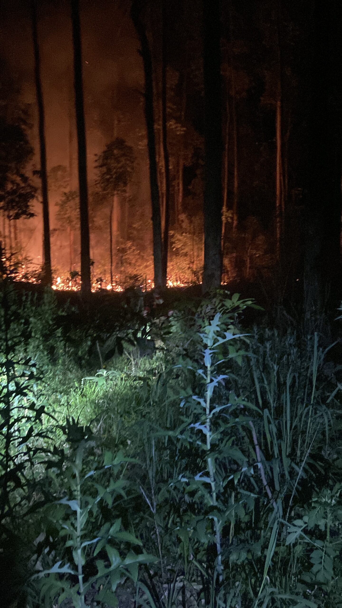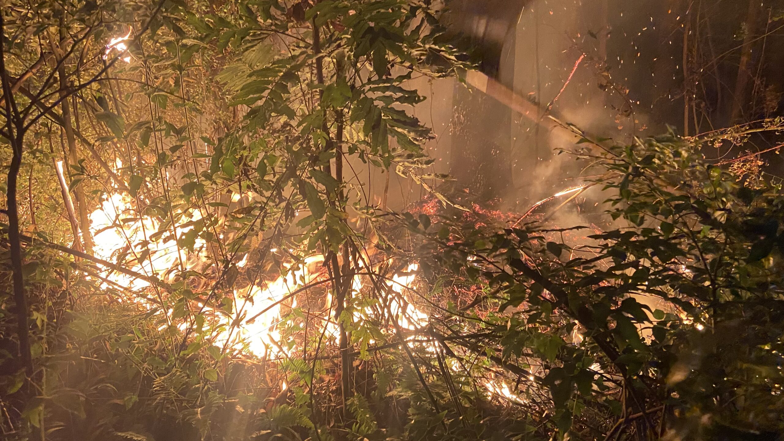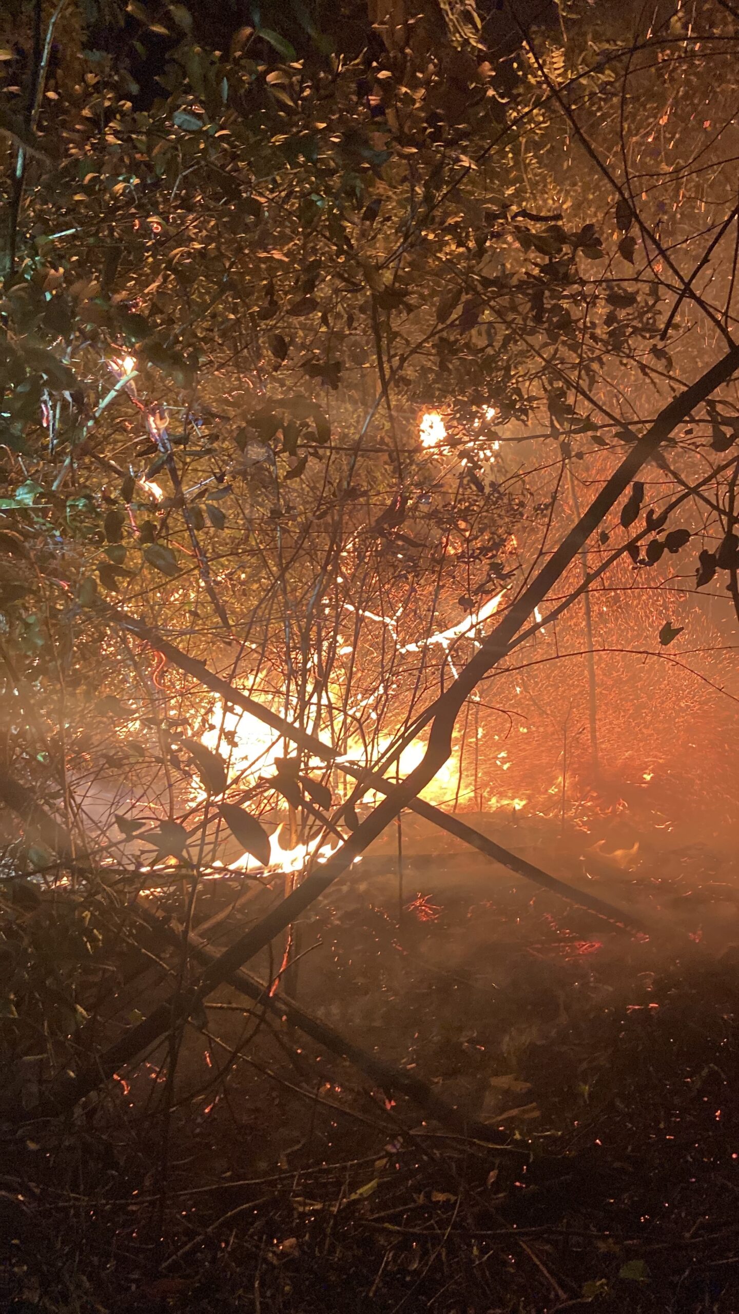 As chamas atingiram um bosque próximo da rua João Pessoa, avançando rapidamente pela vegetação.