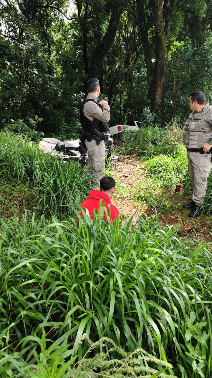A Saveiro foi localizada entrando em uma área de mata. Os indivíduos abandonaram o veículo e correram para o interior da vegetação.