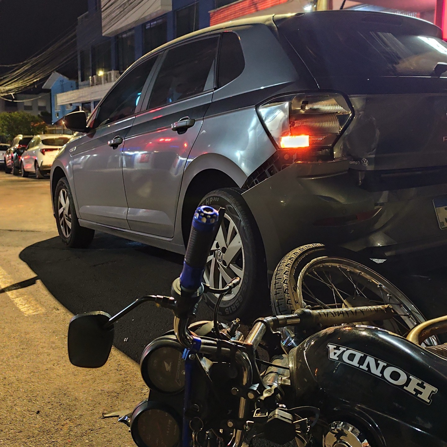 Um acidente de trânsito foi registrado na noite desta quinta-feira (13) na Rua Morom, em Passo Fundo, envolvendo um motociclista e um Volkswagen Polo com placas padrão Mercosul.