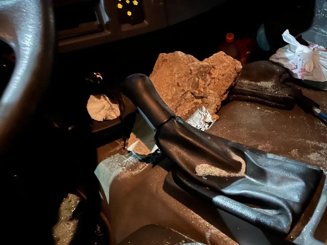 Ao passar pelo km 339, na altura do viaduto de acesso ao Bairro Conventos, uma pedra de concreto foi arremessada contra o para-brisa do veículo.