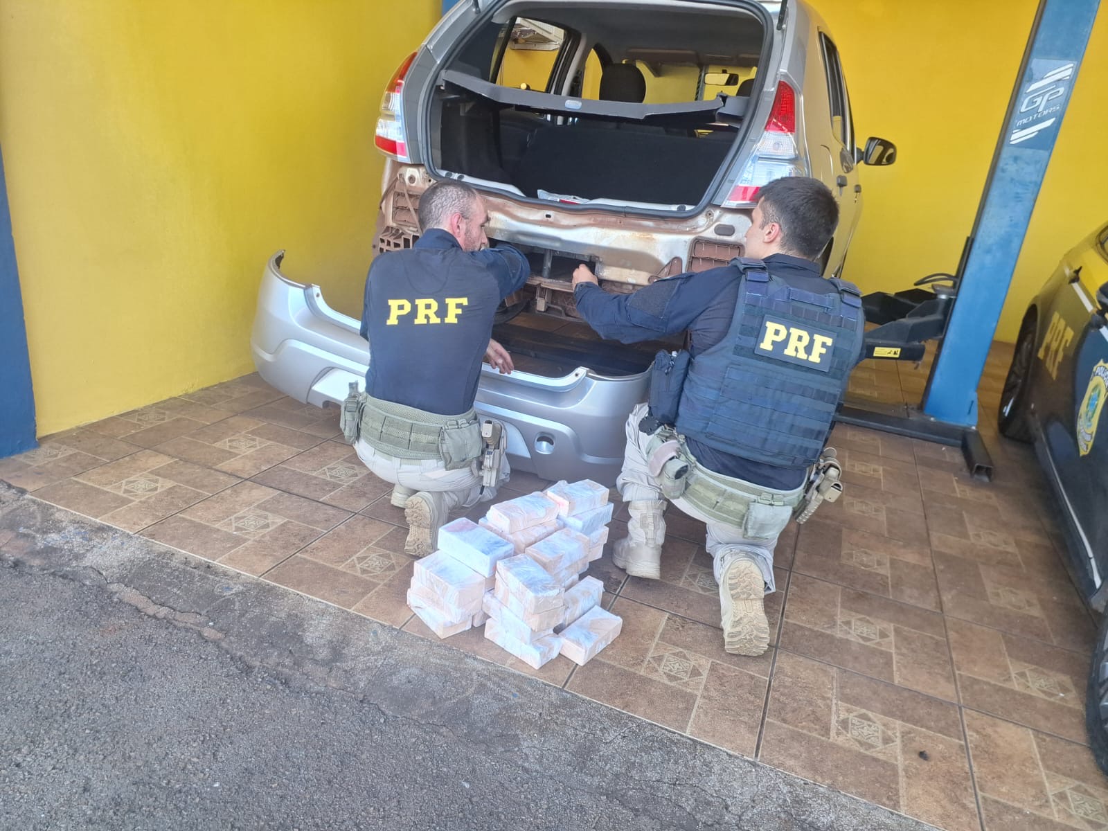 Em fiscalização detalhada no veículo, foi localizado um fundo falso no porta-malas, onde estavam escondidos 65 celulares da marca Xiaomi.