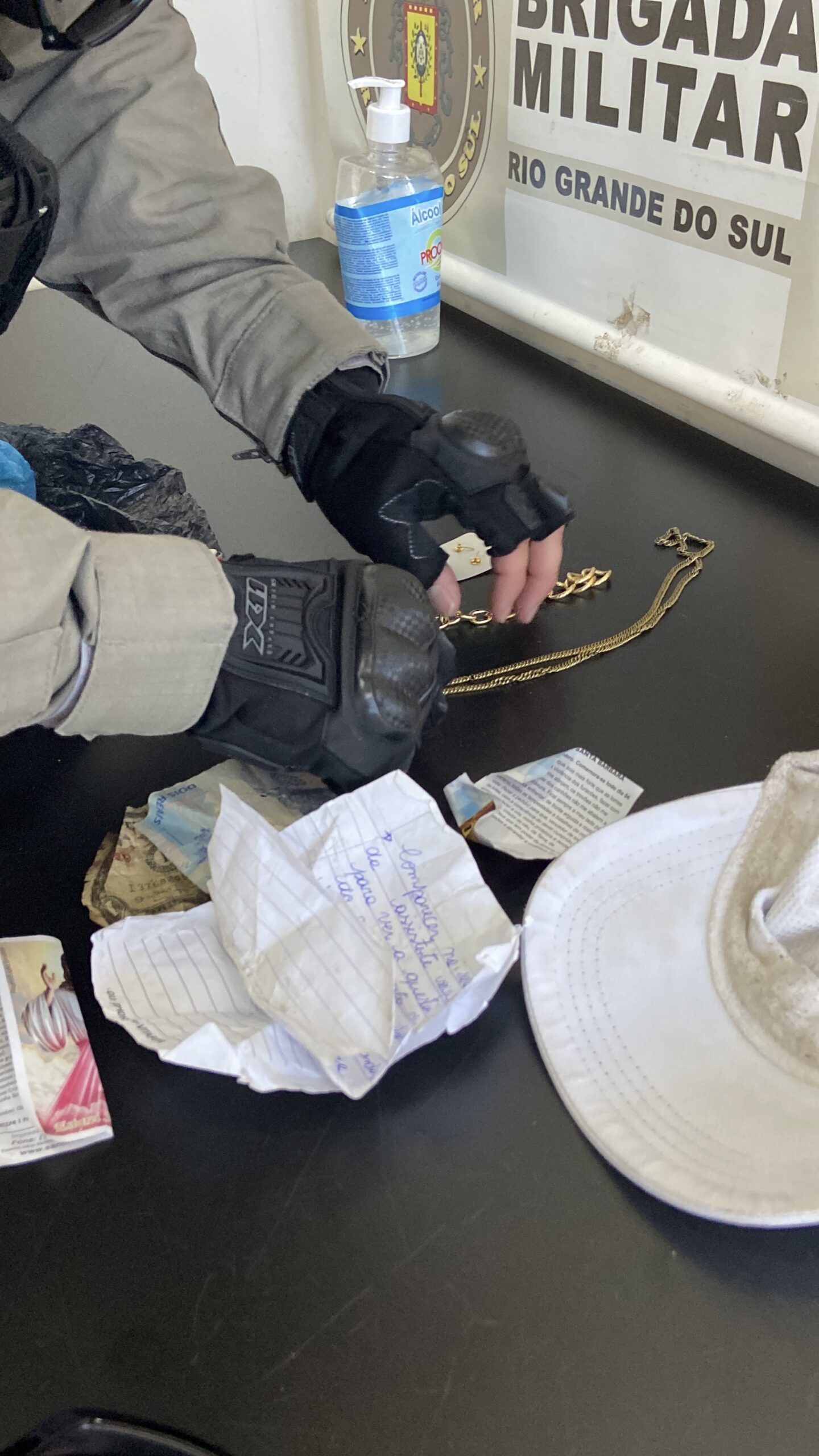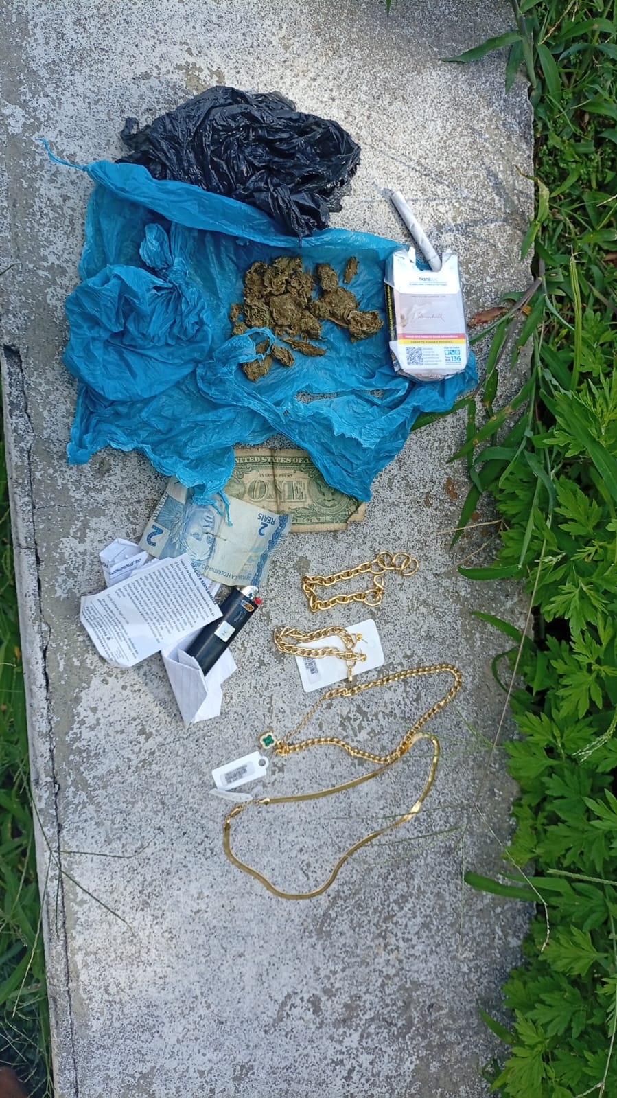 Dentro da bolsa, foram encontradas porções de maconha fracionadas e prontas para comercialização, além de joias possivelmente oriundas de um furto ocorrido em um salão de beleza durante a madrugada.